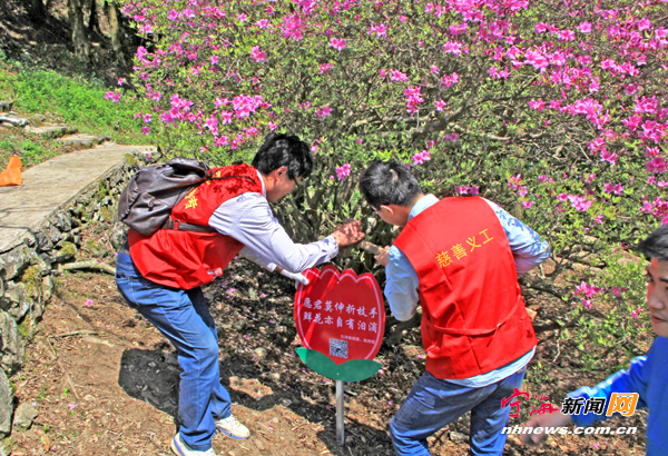 时下正是杜鹃花盛开季节,日前,力洋镇慈善义工大队的10多名队员来到茶山桃花溪,将一块块醒目的提示牌设立在小径岔口及杜鹃花前,以提醒游人不要随意伤害山上的花花草草,共同携手爱护茶山的野生杜鹃花,反对偷盗行为。 (记者李江林通讯员景增杰摄)