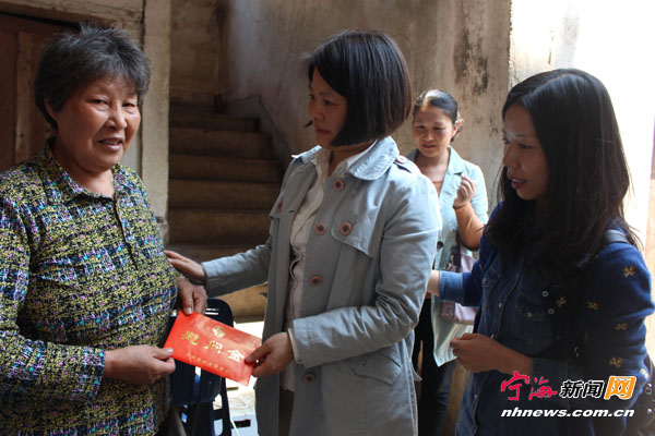 宁海新闻网讯 日前,湖西社区工作人员陪同桃源街道妇联主席走访慰问了辖区贫困妇女金大姐家,送去了慰问金,并详细询问了她的生活现状,鼓励她克服困难,树立生活的信心。金大姐的儿子出过车祸留下严重的后遗症,老伴脑溢血中风瘫痪在床,家庭十分困难。
