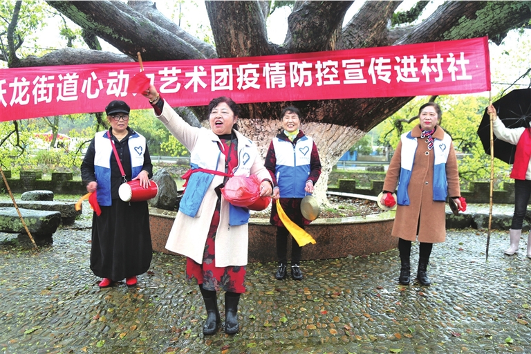 “出门必须戴口罩,保持距离一米远,公共场合要少去,讲得对。”3月25日上午,景色秀丽的跃龙街道草湖村前河道旁的大樟树下,来自跃龙街道心动力艺术团的一批文艺爱好者,冒雨开展疫情防控知识宣传活动。连日来,心动力艺术团疫情防控宣传队手拿小喇叭,早出晚归,深入辖区农村社区,走街串巷开展疫情防控宣传。并精心编排了通俗易懂、幽默诙谐、轻松愉快的三句半、快板疫情防控宣传方式,受到群众的好评。